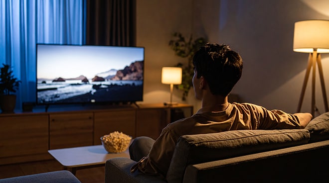 仕事を終えて、気分を変えてリフレッシュする。ビール片手に、テレビで好きなコンテンツを愉しむ時間。家族はもう寝ているから、音量を上げなくても人の声が聴きとりやすく臨場感を味わえる“テレビ用サウンドバー”が一人時間を豊かにします。