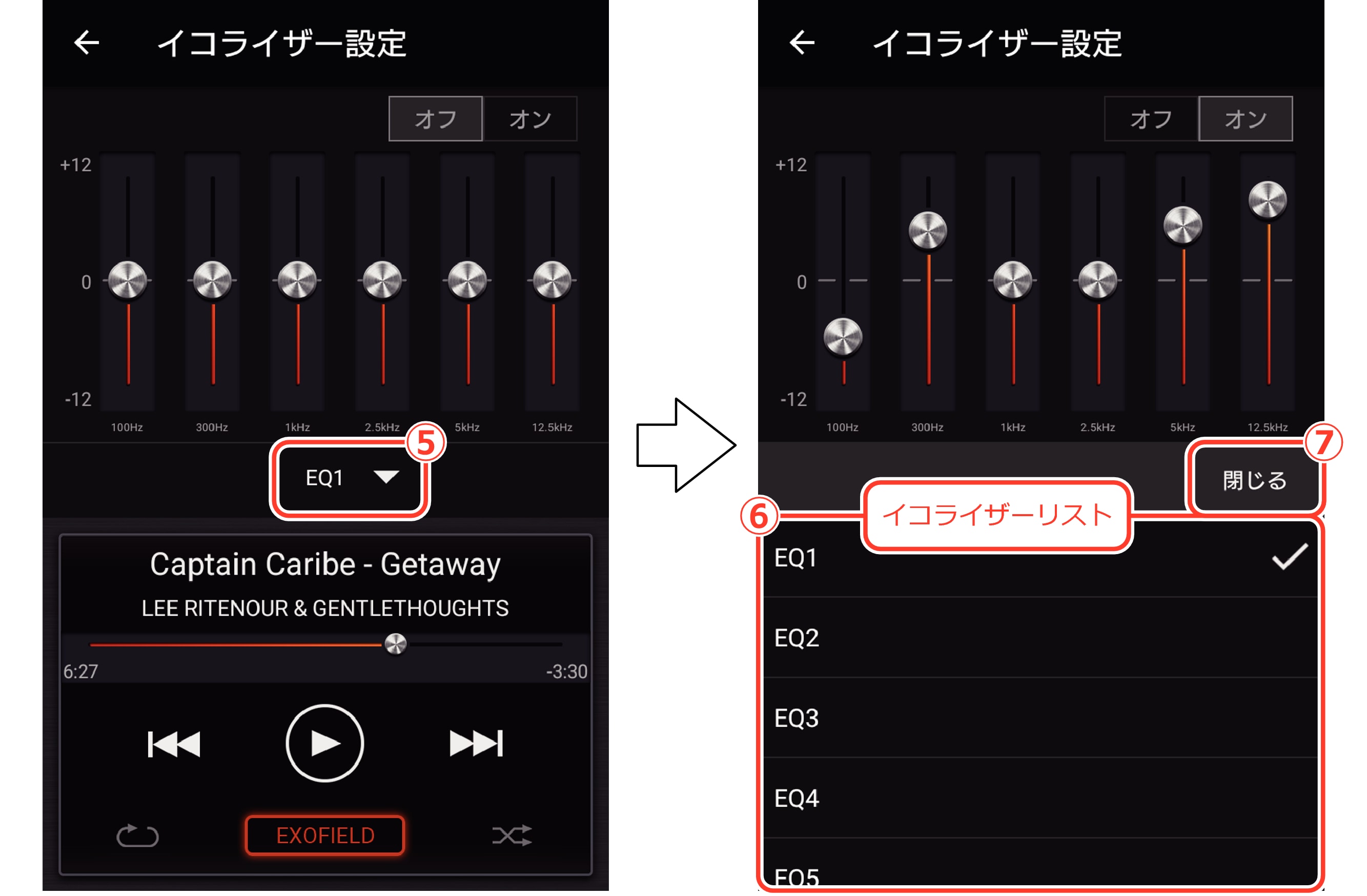 EXOFIELD効果のオン/オフによってイコライザーを使い分けると、それぞれに適した音質でお楽しみいただけます。