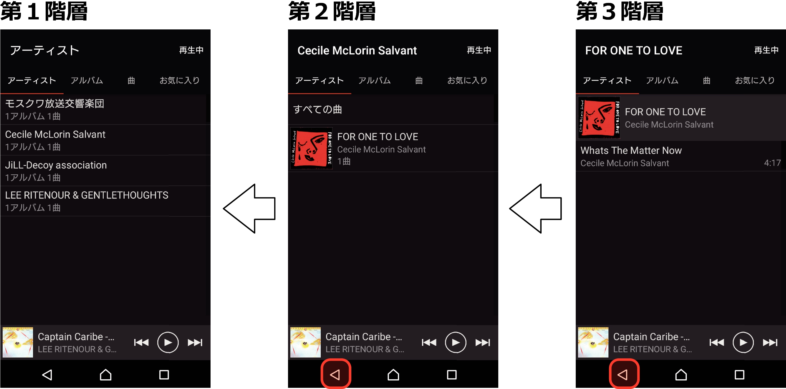 【アーティストリスト】は第3階層まで、【アルバムリスト】は第2階層までの構成となっており、上の階層に移動したい場合には、スマートフォンの「
