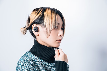 (Reol)撮影のときに、顔の周りに手を添えたりしたら、突然外音取り込みされてびっくりしたんですけど(笑)。これ、イヤホンをタップしてあげると、音量を上げたり、逆に外の音や会話が聴こえるように中の音が下げられるんですよね。それは、今の時代にめちゃ合ってるなと思います。駅の構内とかで友達に会う時に、今までだったらイヤホンを外さないと会話できなかったのが、タップしただけでそのまま話せるのはすごい便利かも。あと、3回タップでバスブーストオンされるとか、ケースで充電できるのも、もちろんいいなと思いました。