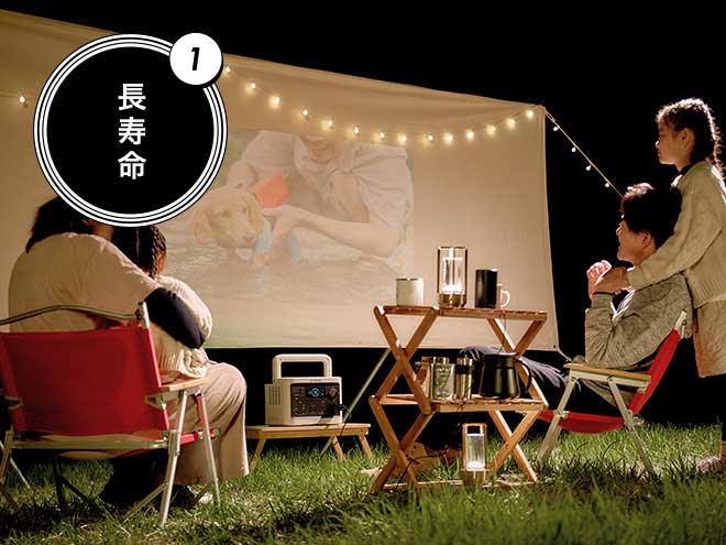 三元系リチウムイオン充電池を採用しているポータブル電源もありますが、こちらの「充放電サイクル」は約500回※1のため、リン酸鉄系リチウムイオン充電池はおよそ6倍~8倍の長寿命となります。
