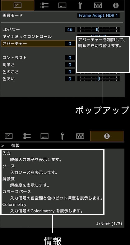 暗い映像やHDRコンテンツの再生時でもメニューが見やすくなり、視認性が向上します。